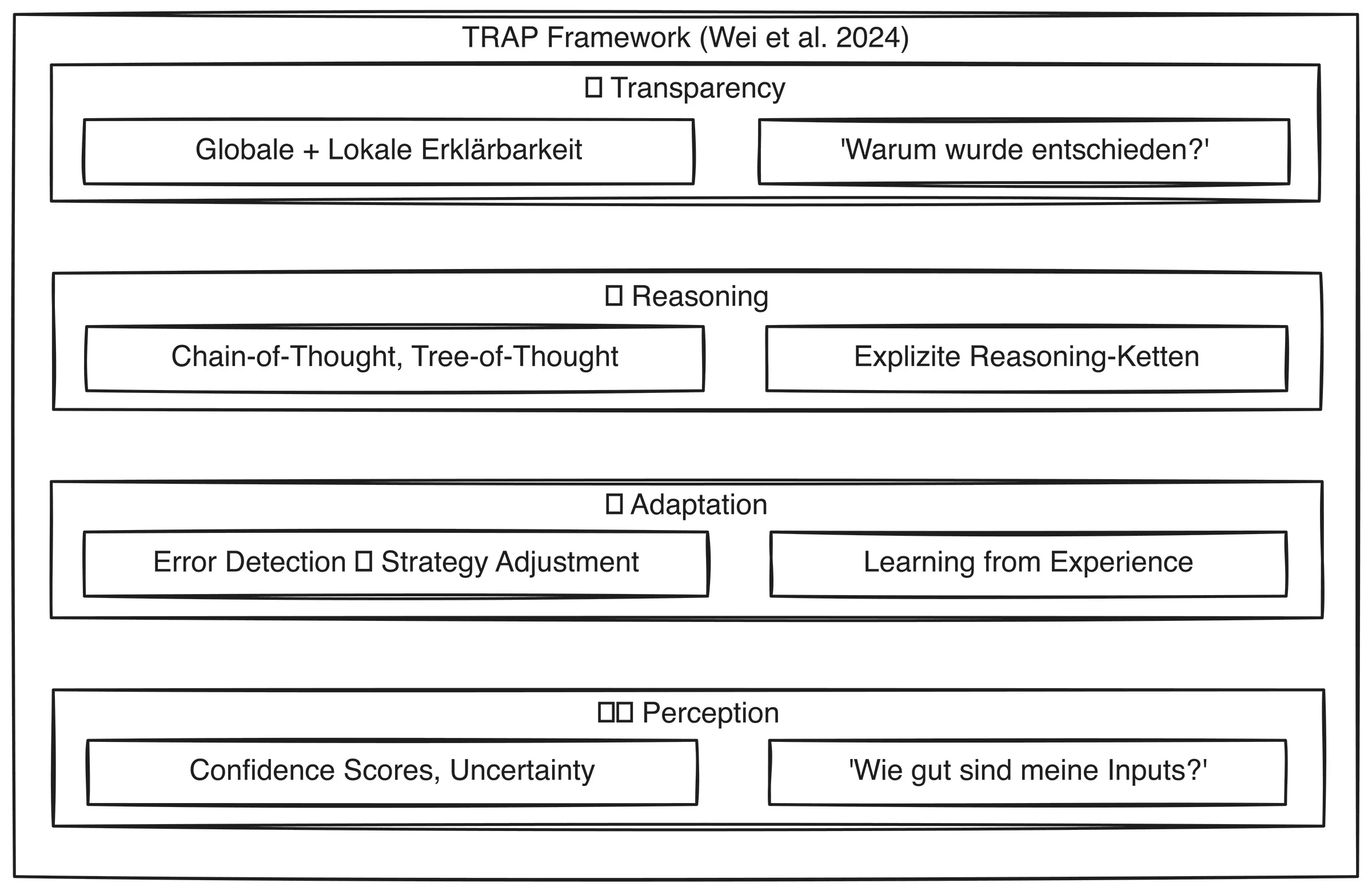 Wei, Shakarian und Kollegen haben 2024 das TRAP-Framework vorgestellt – eine strukturierte Methode, um Metacognition in KI-Systemen zu implementieren. TRAP steht für vier Säulen, die in der Abbildung dargestellt sind.