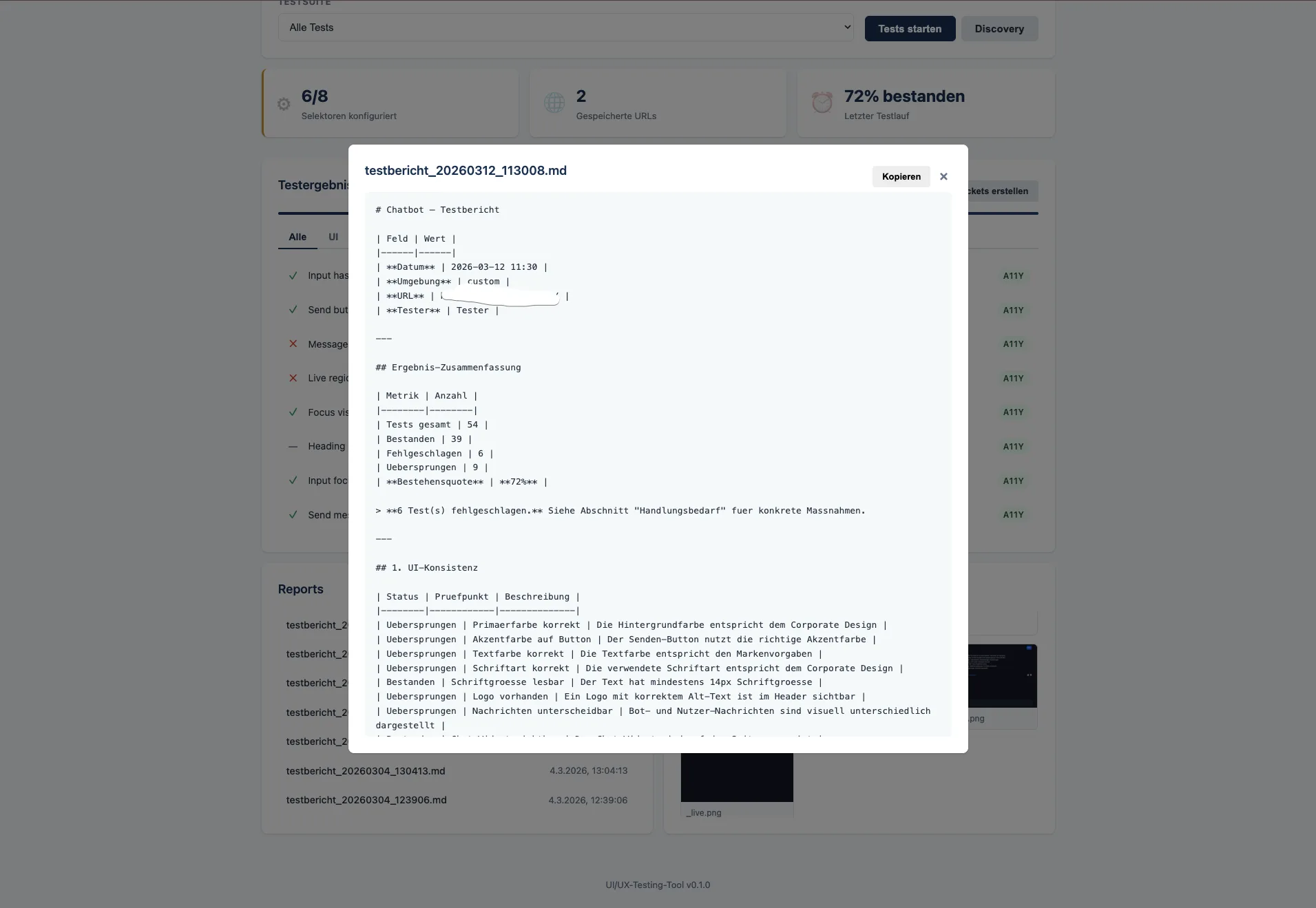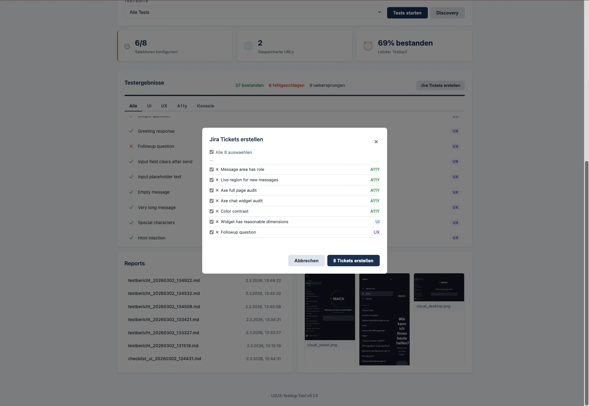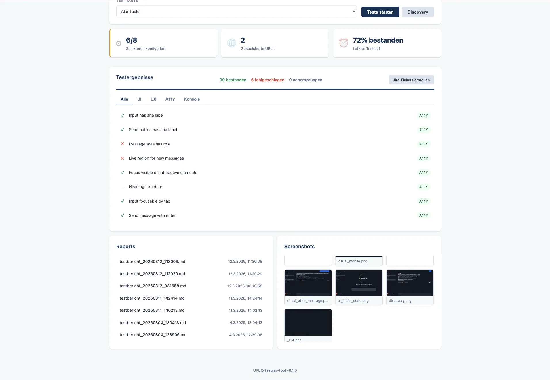 Das Tool automatisiert die technische Qualitätsprüfung der Oberfläche: Es prüft, ob der Chatbot korrekt dargestellt wird, ob er zugänglich bedienbar ist und ob Gesprächsflüsse technisch funktionieren.